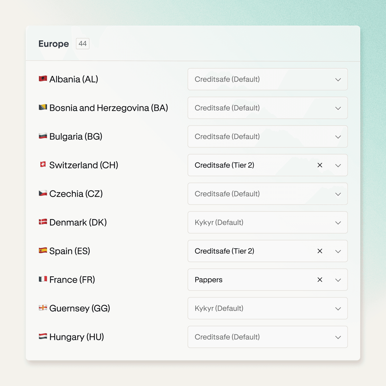 Bring contracts you've already negotiated with major providers, incuding Creditsafe, Kyckr and World-Check). Use Dotfile's pay-as-you-go access for smaller markets where you don't have volume.