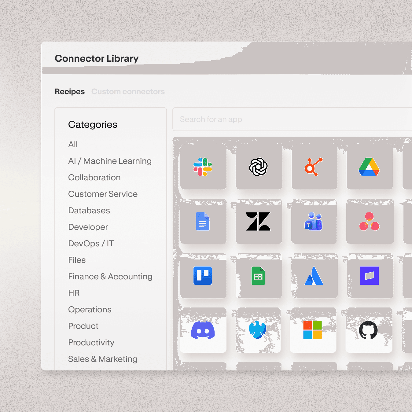 Access 1,000+ apps through pre-built connectors, or build custom connections to proprietary data sources and internal systems.
